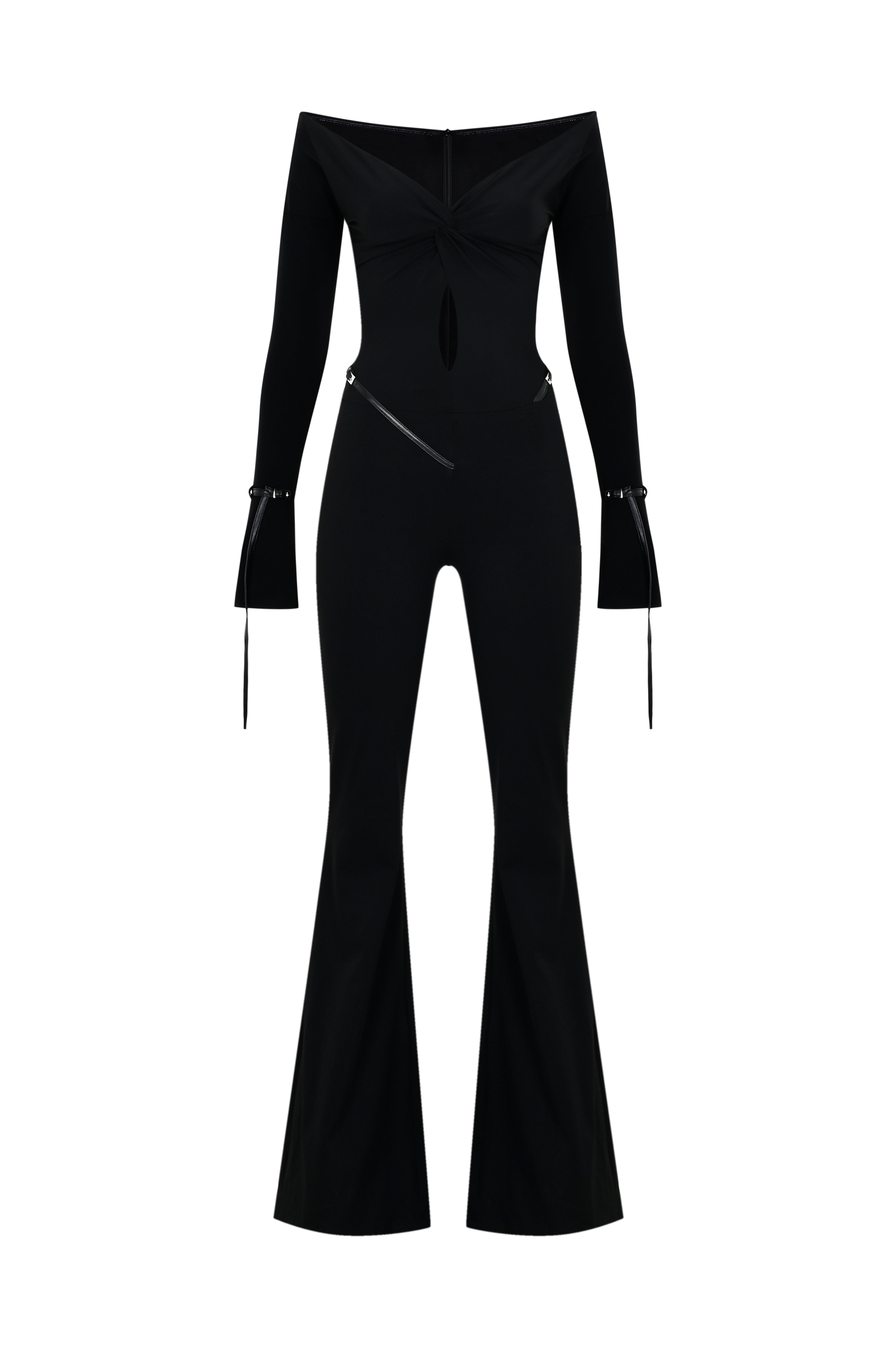 The body-hugging, flared-leg jumpsuit is made from high-quality stretchy fabric and designed with an off-the-shoulder neckline. Faux leather belt details adorn the front and both cuffs. Additionally, there are functional concealed zippers at the wrist sections of both sleeves. The front features a knotted keyhole detail, and the back has a hidden zipper closure for easy wear.