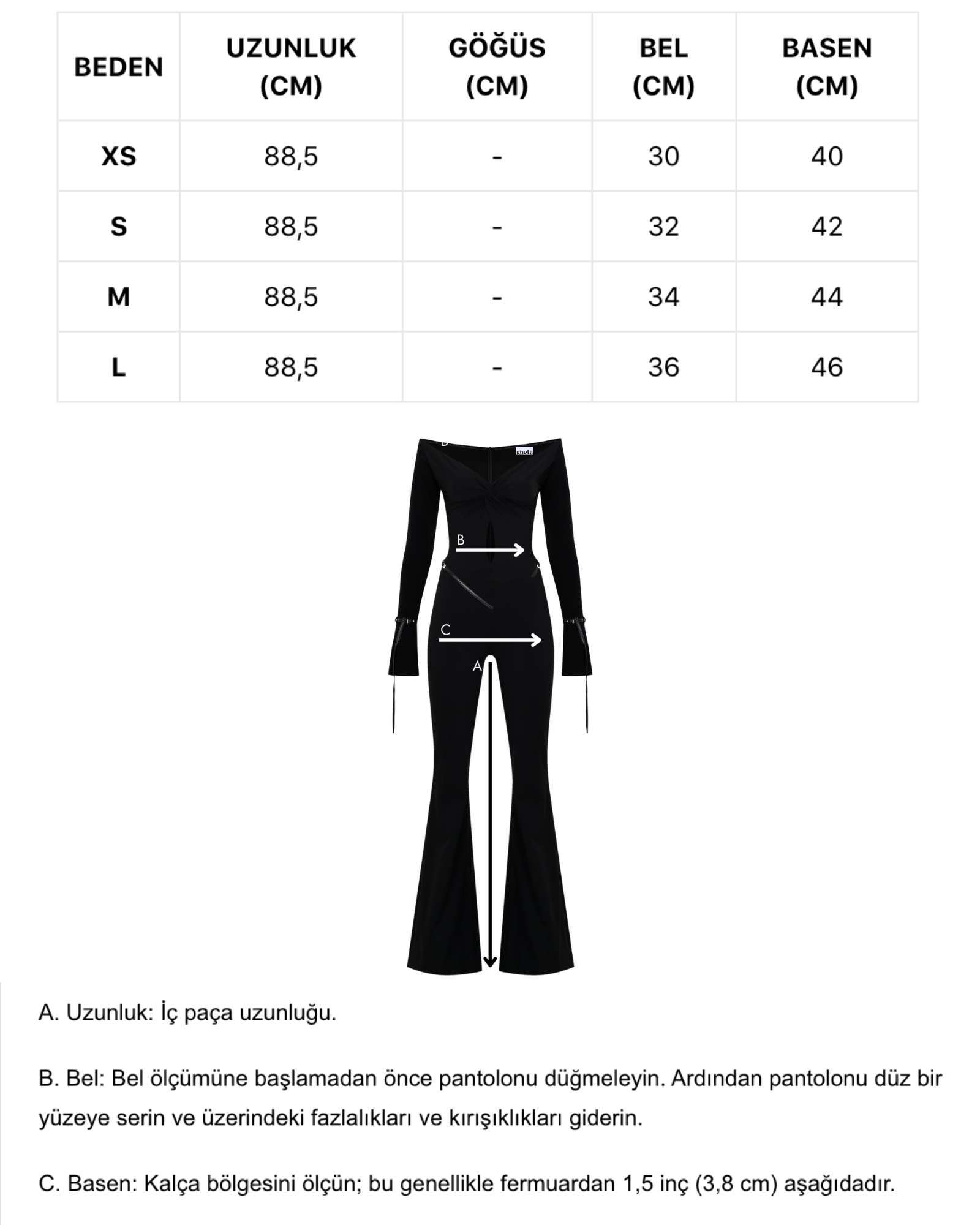 Yüksek kaliteli esnek kumaştan yapılmış, vücudu tam saran İspanyol paça tulum, düşük omuzlu olarak tasarlanmıştır. Ön kısmında ve her iki manşette suni deri kemer detayları bulunur. Ayrıca her iki kolda bilek kısımlarında işlevsel olarak kullanılabilen gizli fermuar detayı vardır. Ön tarafta düğümlü bir anahtar deliği vardır. Arkadaki gizli fermuar kapama detayı ile rahat bir şekilde giyilebilir.