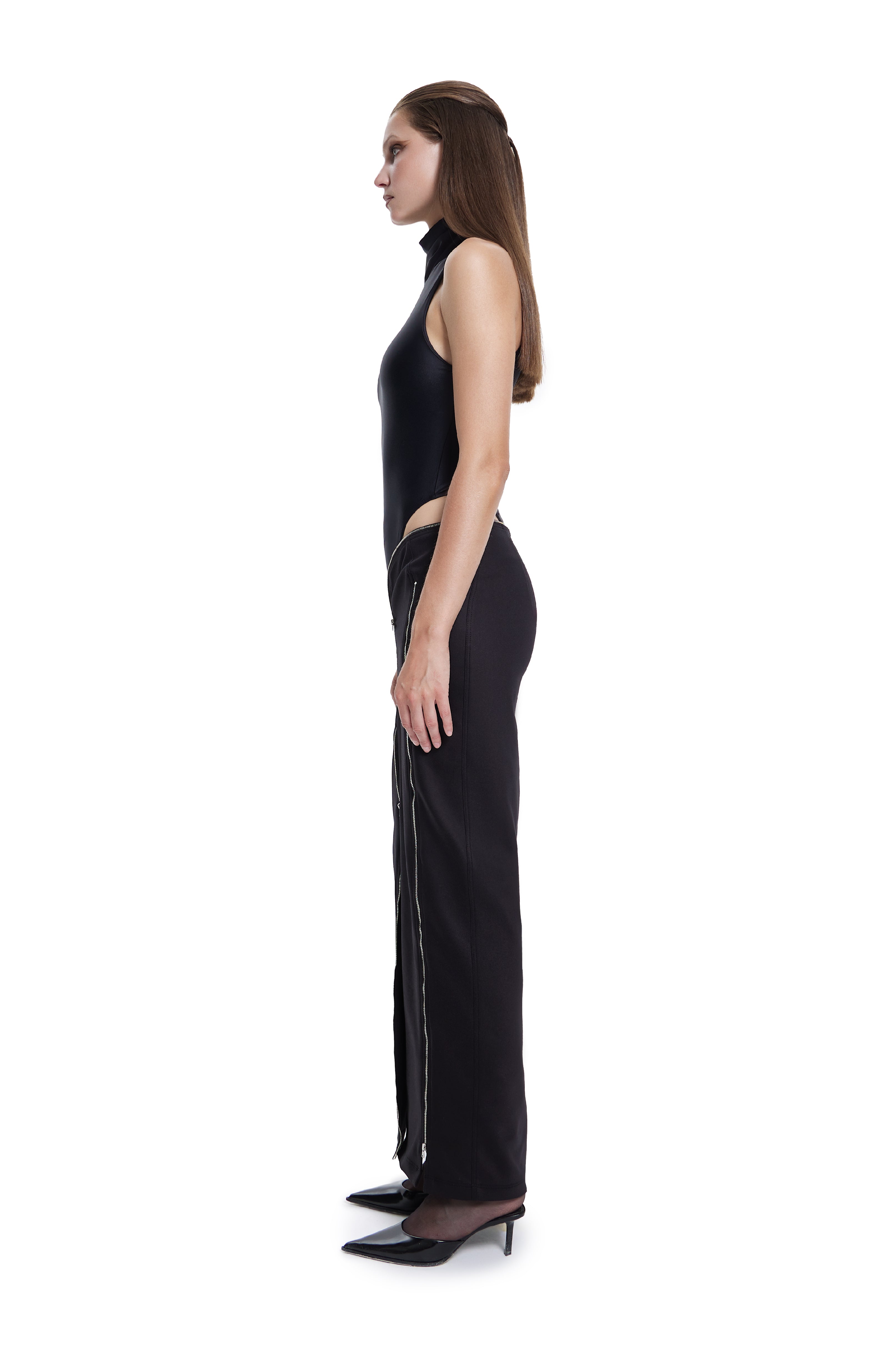 The Manipulator Skirt boasts three adjustable zipper details, both on the sides and the front. These zippers not only serve as a fashionable element but also allow you to customize the fit and create various looks.