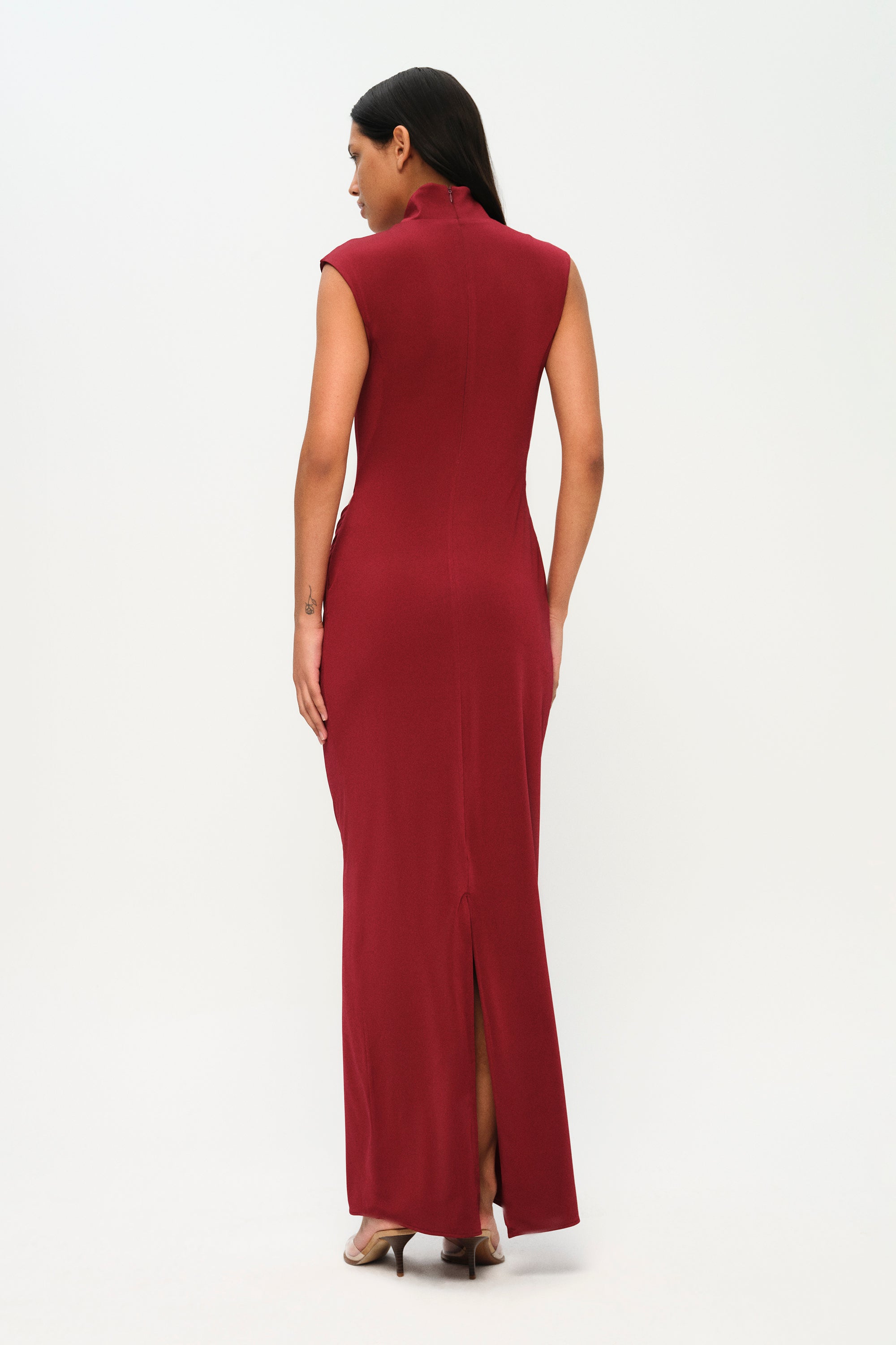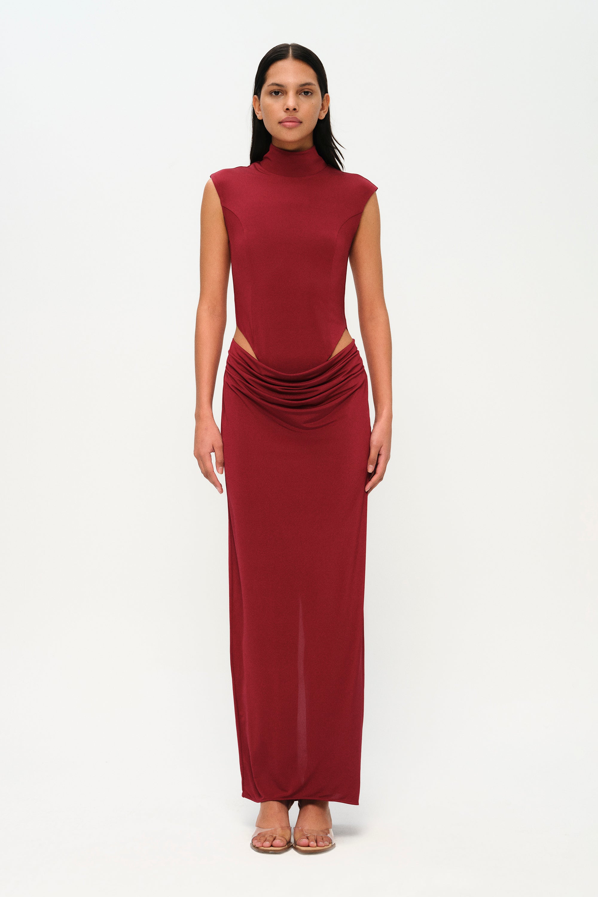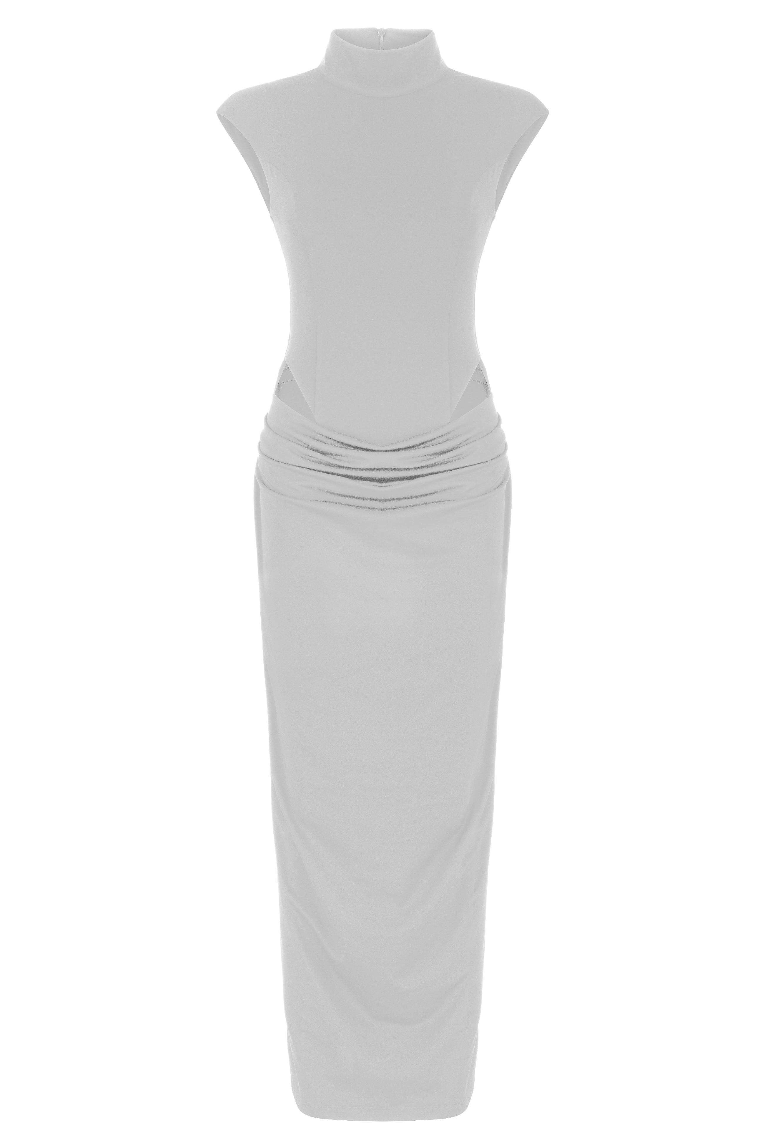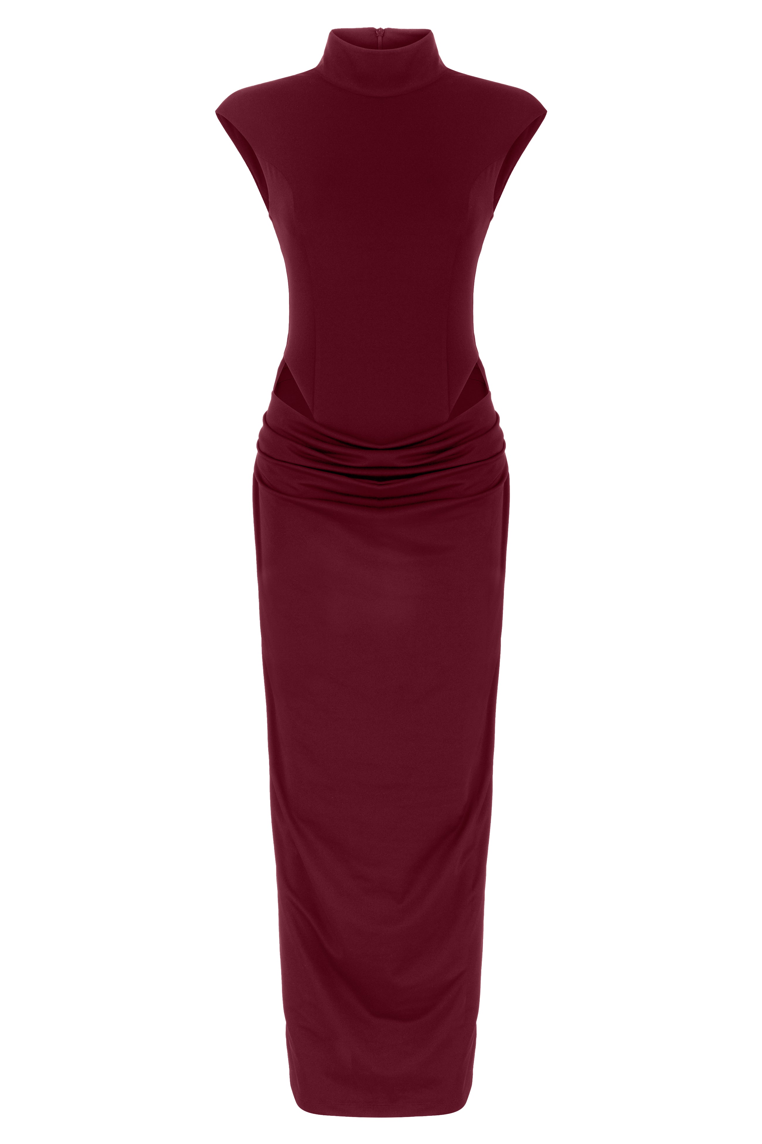 Sharp lines meet soft drapes. Our Stunner Dress features a sleek high neckline, side cutouts, and sculpted gathering around the hips. Elegant but unexpected guaranteed to turn heads.