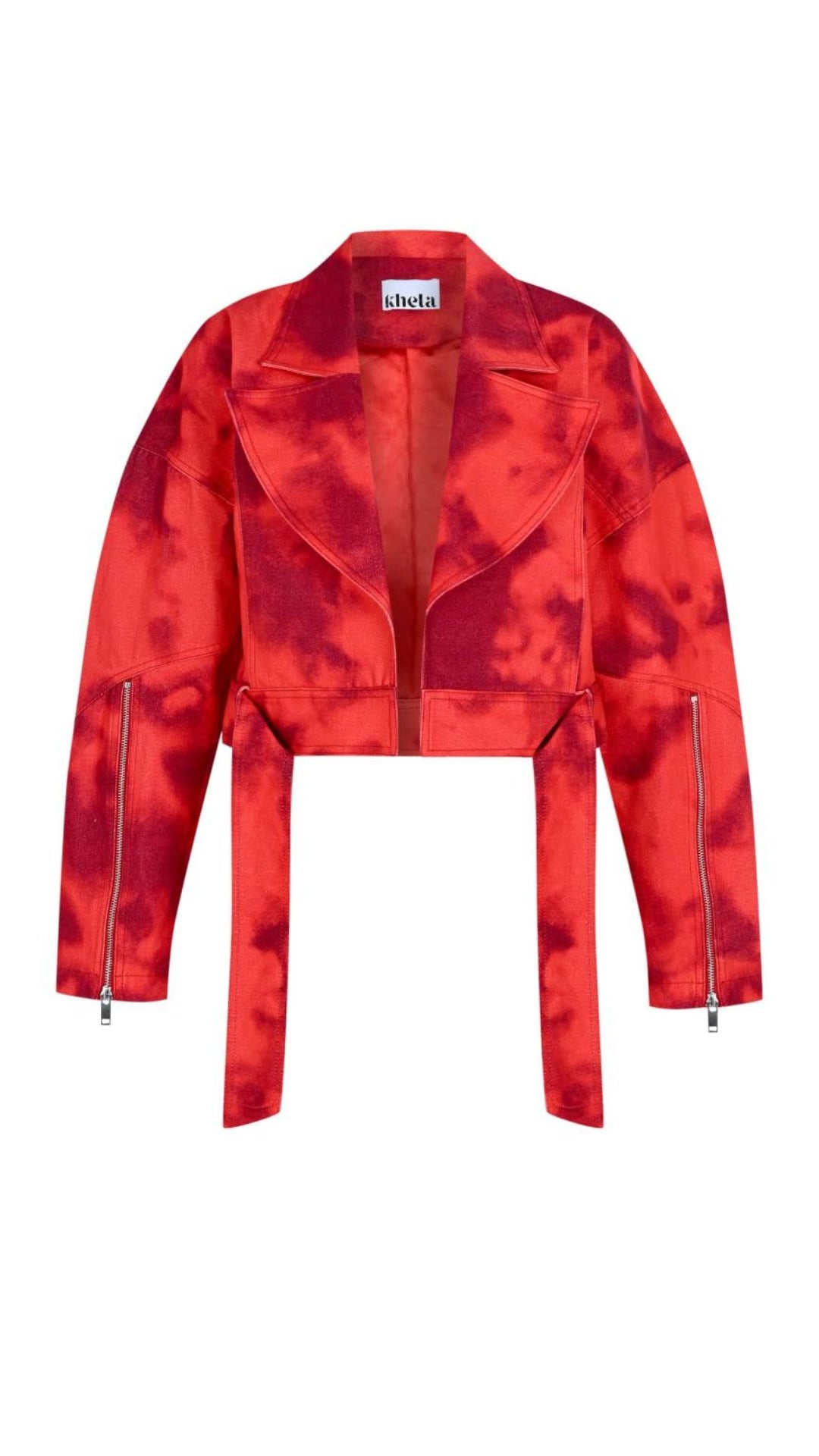 Crafted entirely from 100% cotton and featuring mottled pattern on gabardine fabric. This oversized jacket boasts a relaxed fit with dropped shoulders and a shawl collar. Detailed with metal zipper accents on the sleeves and tie straps at the hem.