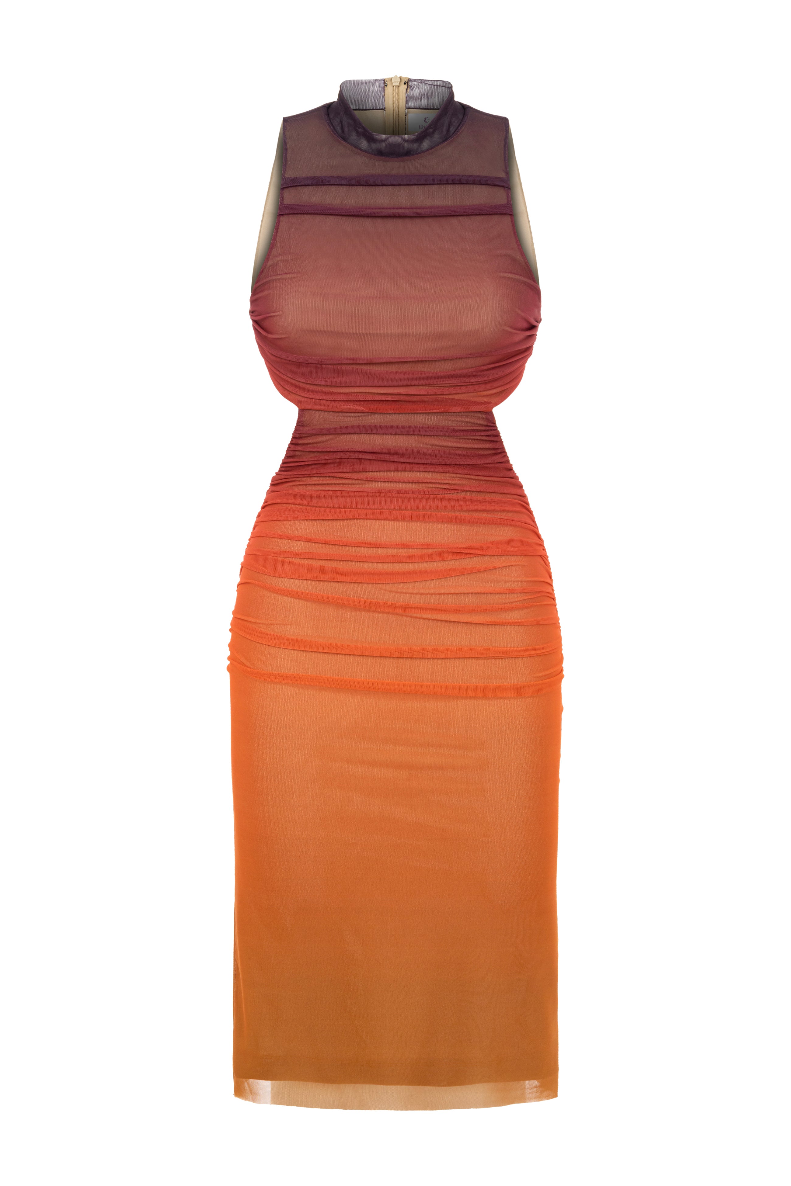 This stunning dress is designed to make you stand out from the crowd with its bold and vibrant orange gradient print on mesh fabric.