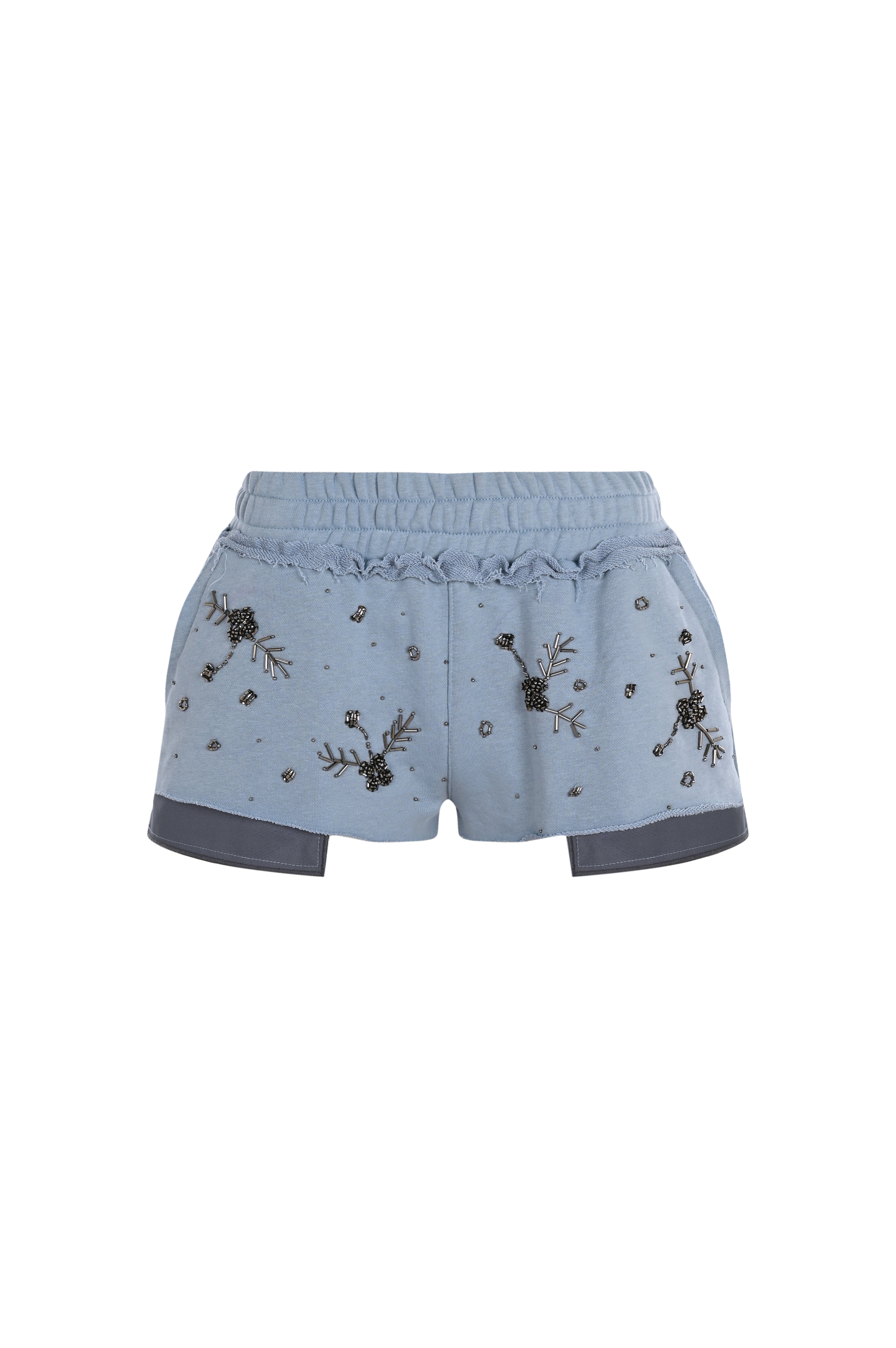 Blue shorts adorned with bead-embellished floral patterns and distressed seam detailing.