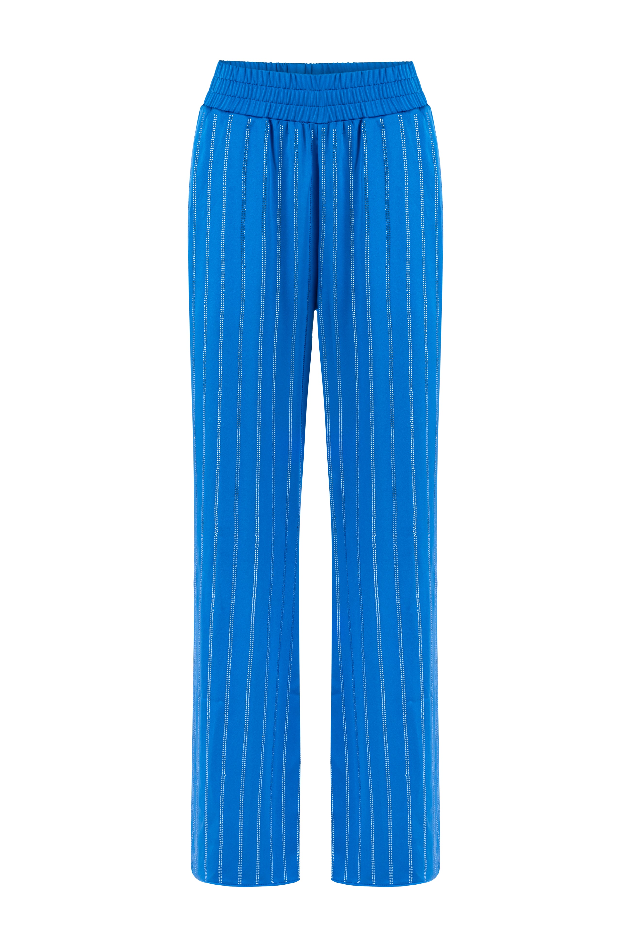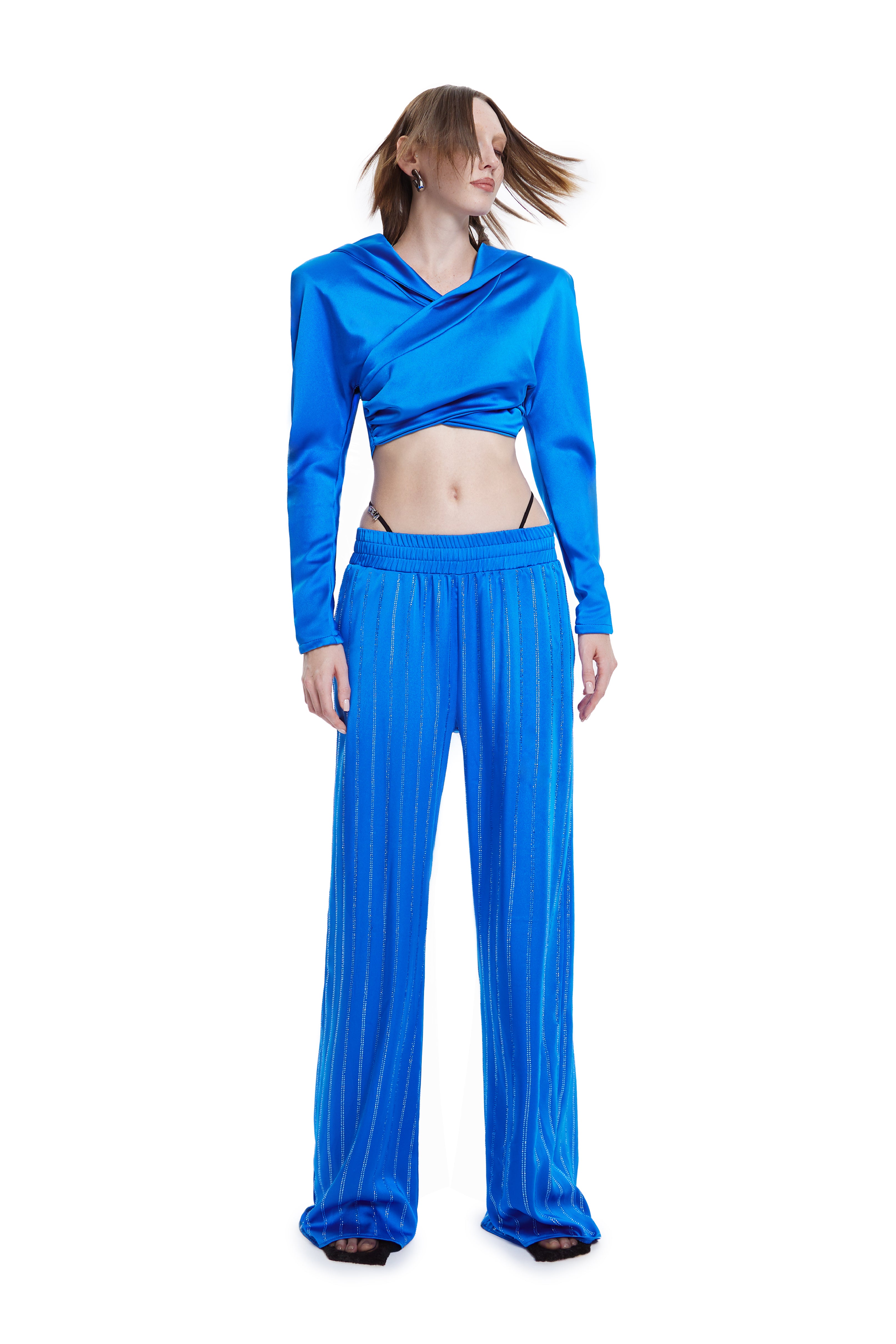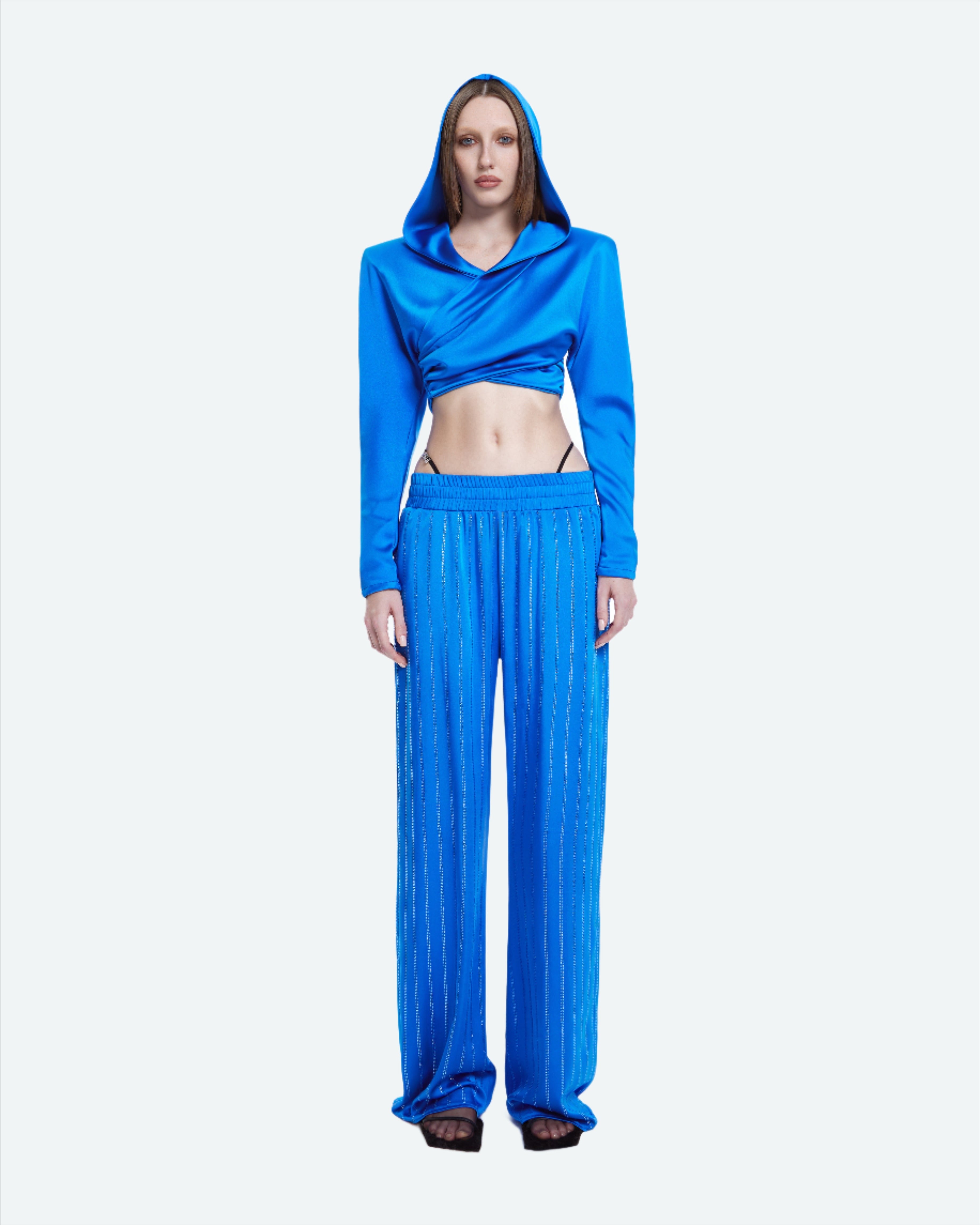 The Blue Luminescent Pants stand out with their striking vertical stripe details made of sparkling stones, adding a touch of elegance to your look. Their eye-catching color will draw attention wherever you go. Thanks to their flexible waistband, they offer both style and comfort, making them a wardrobe staple.