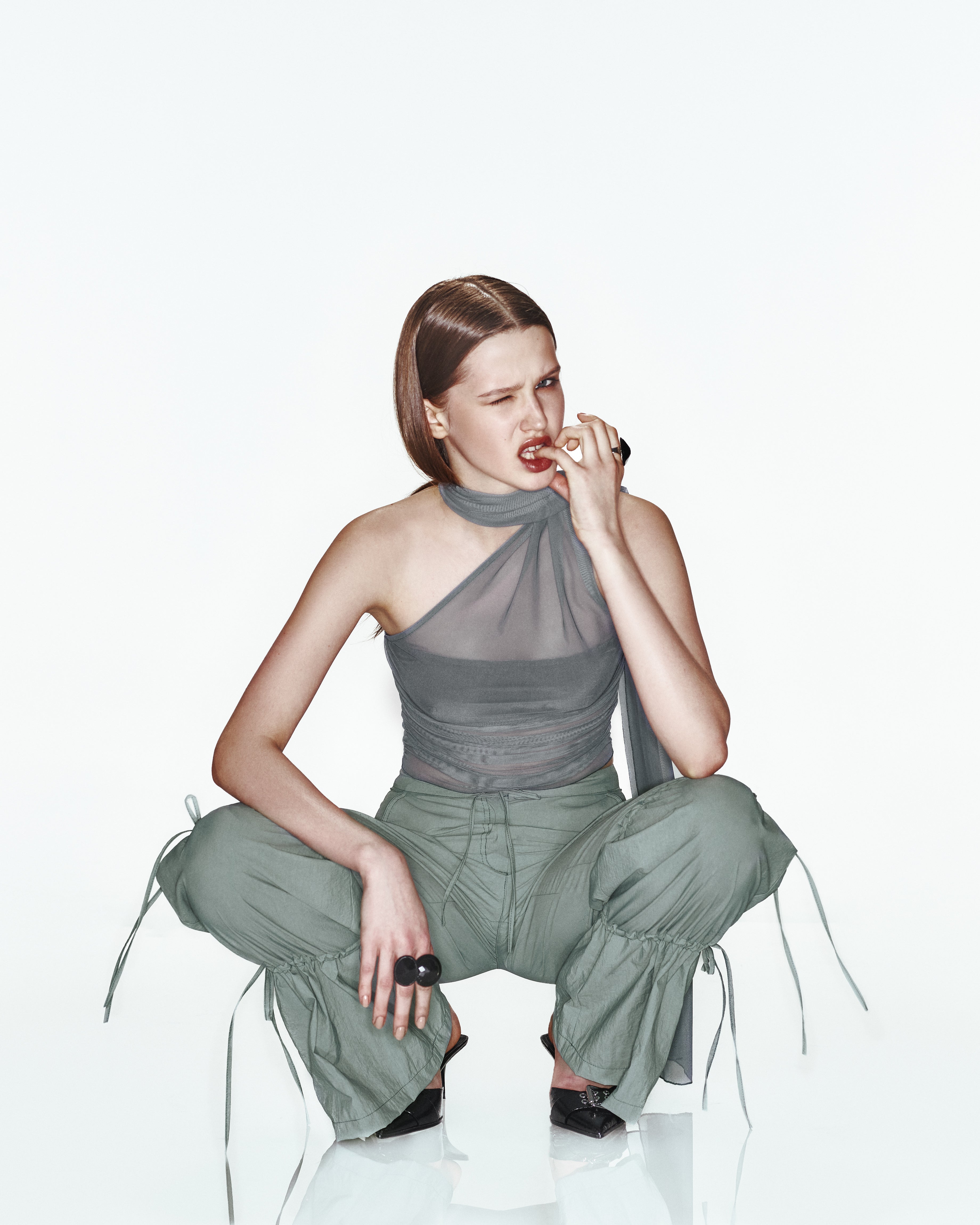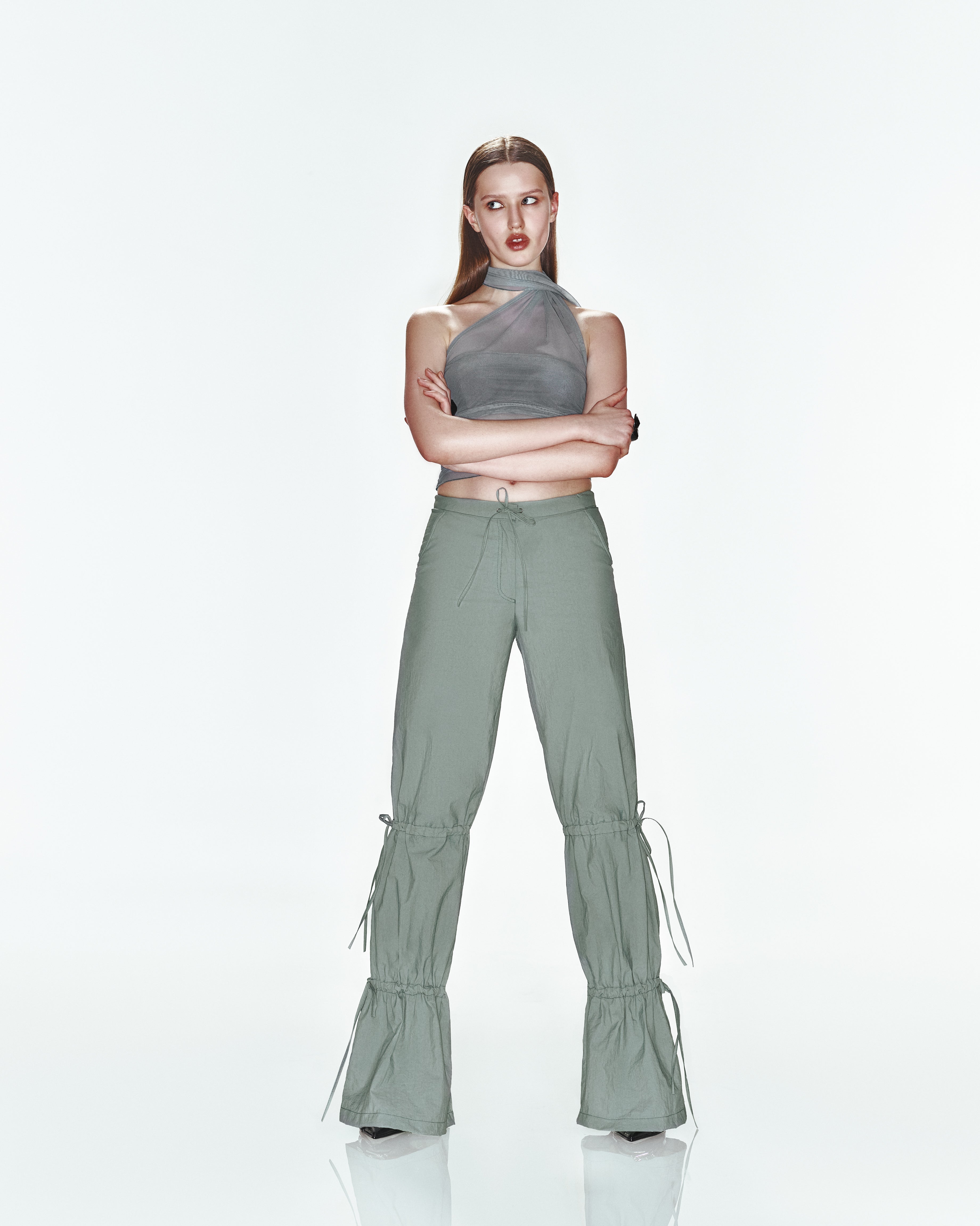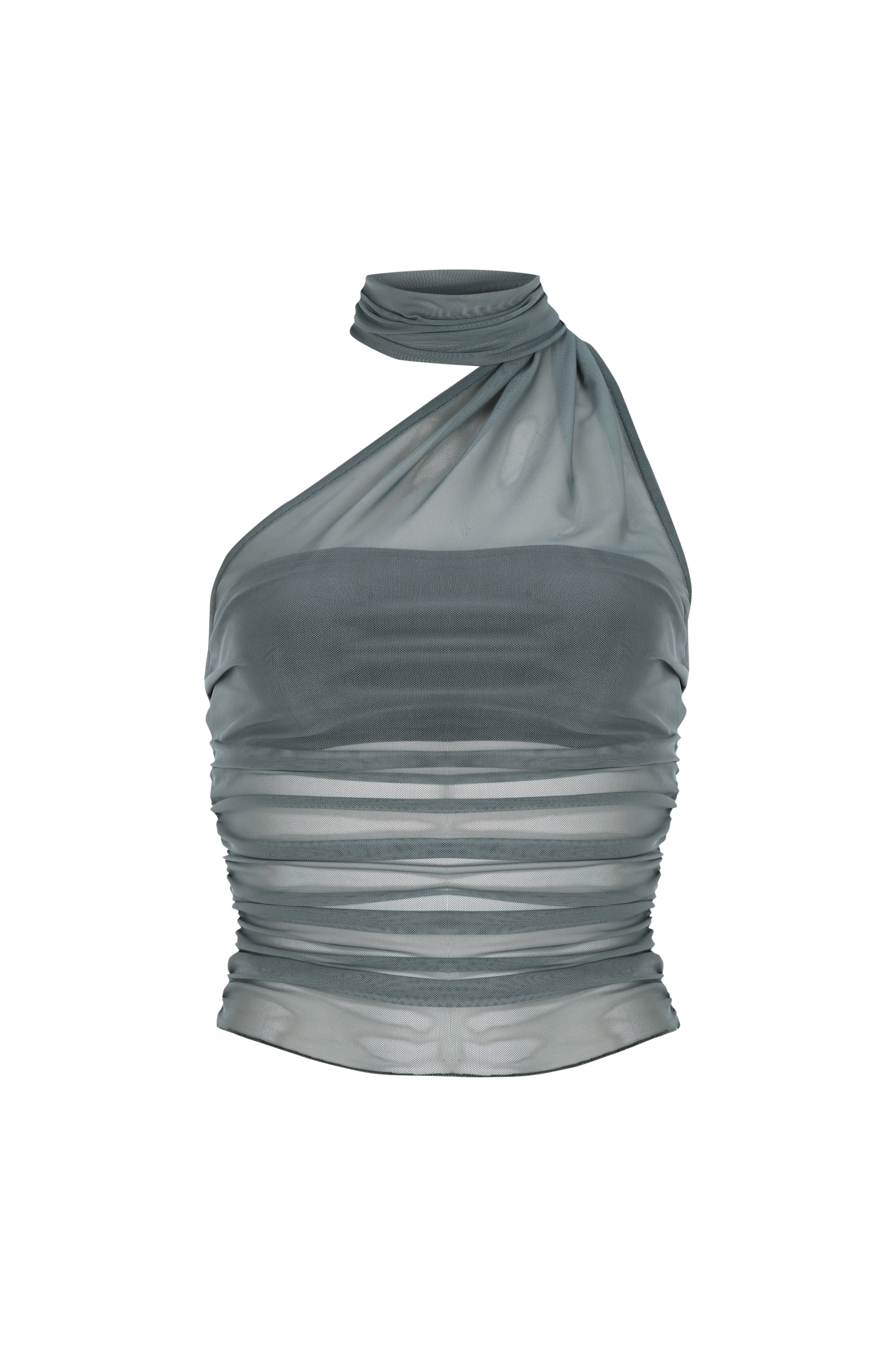 The sheer top with ruched details on the sides is sold with a separate strapless bralette.