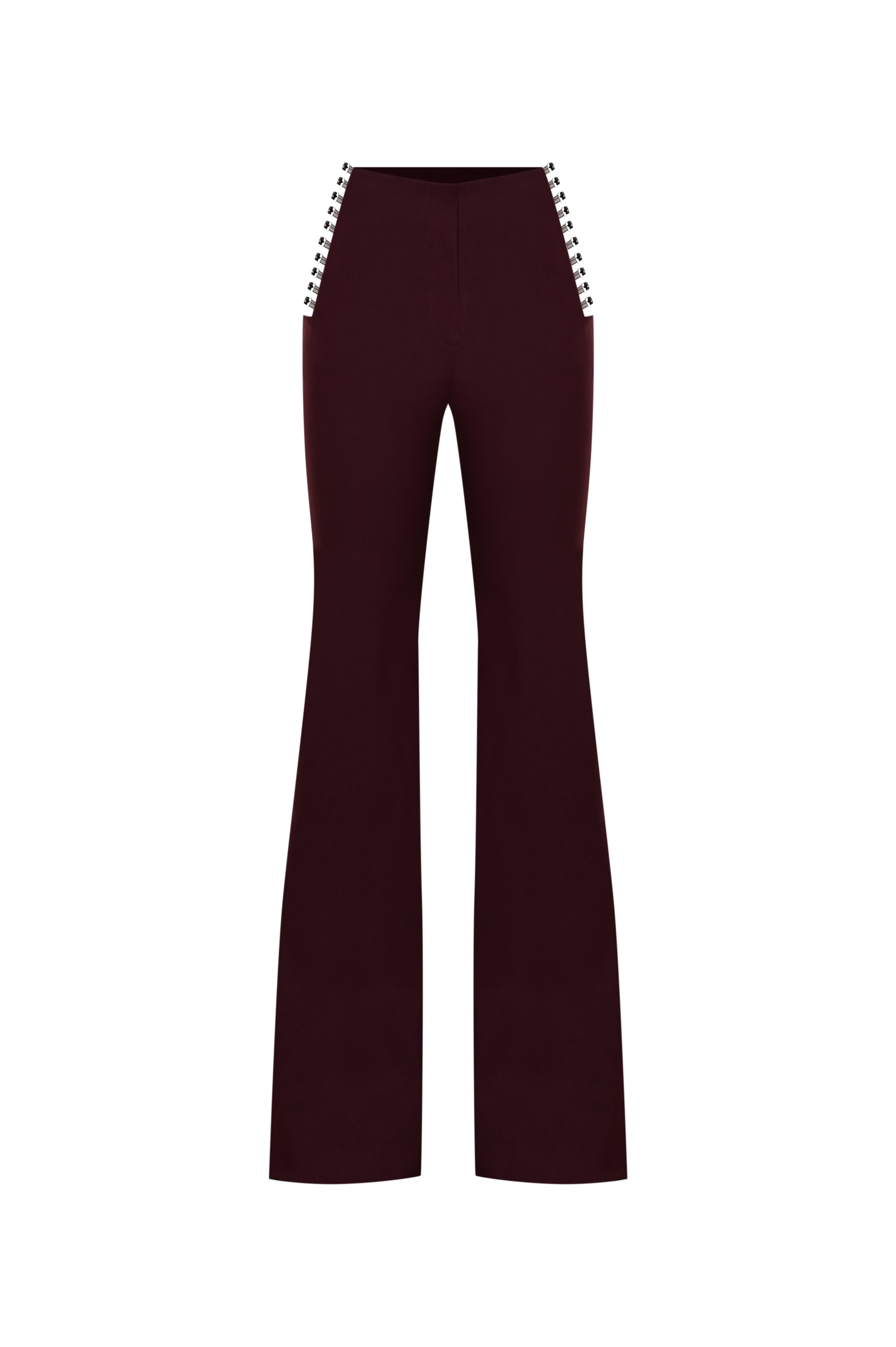 Belt details are thoughtfully incorporated to elevate the aesthetics of these burgundy flare-fit pants while also seamlessly complementing the overall design. The cut-out accents add an edgy twist, making the pants stand out with a bold, modern touch. The multiple belt accents, combined with the flare silhouette and sleek design, make this piece both stylish and versatile.