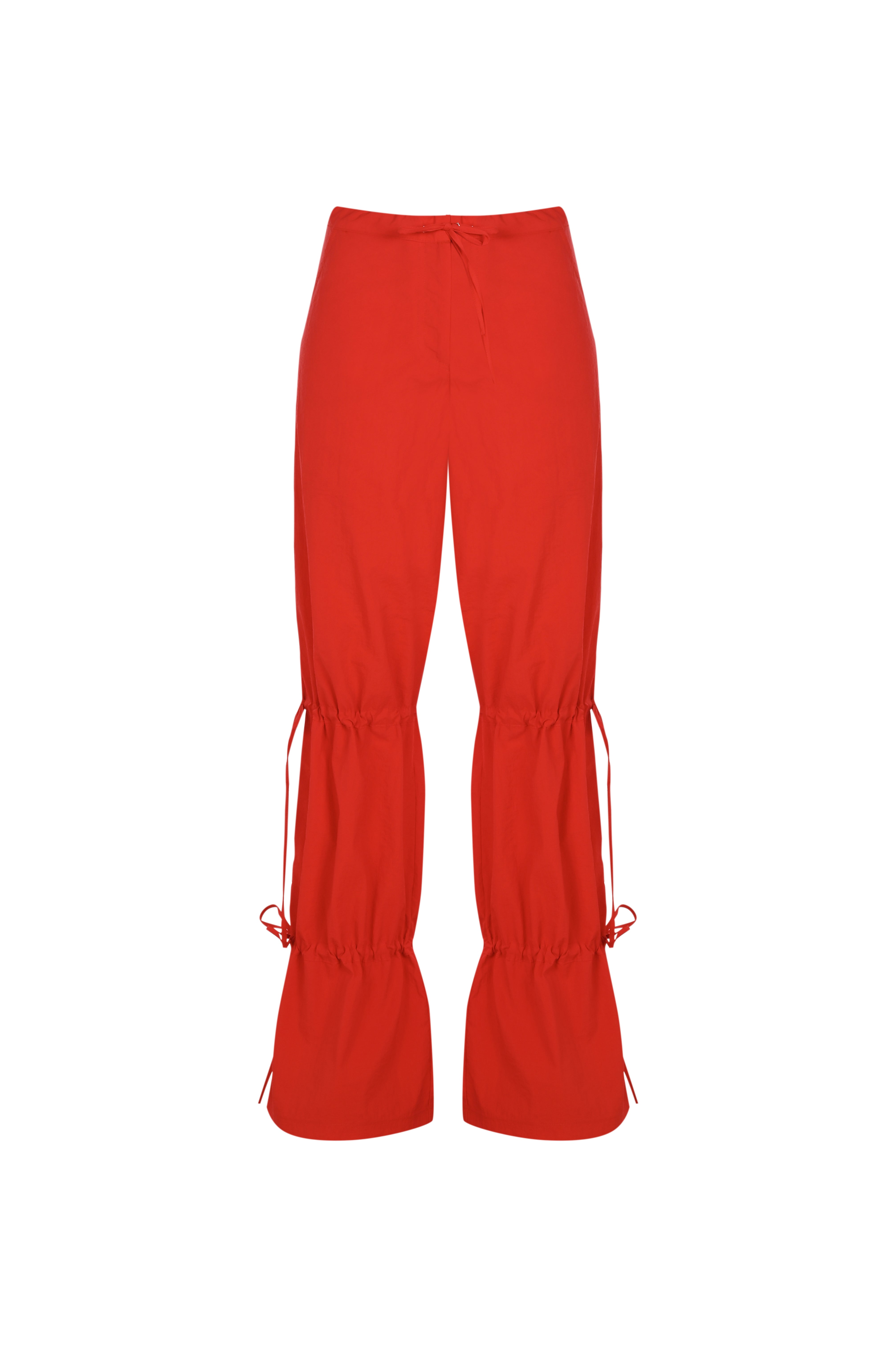 These pants are designed with adjustable drawstring ruching at the knees and wrists, feature two side pockets, and include a front belt with eyelet detailing, all crafted from red parachute fabric.
