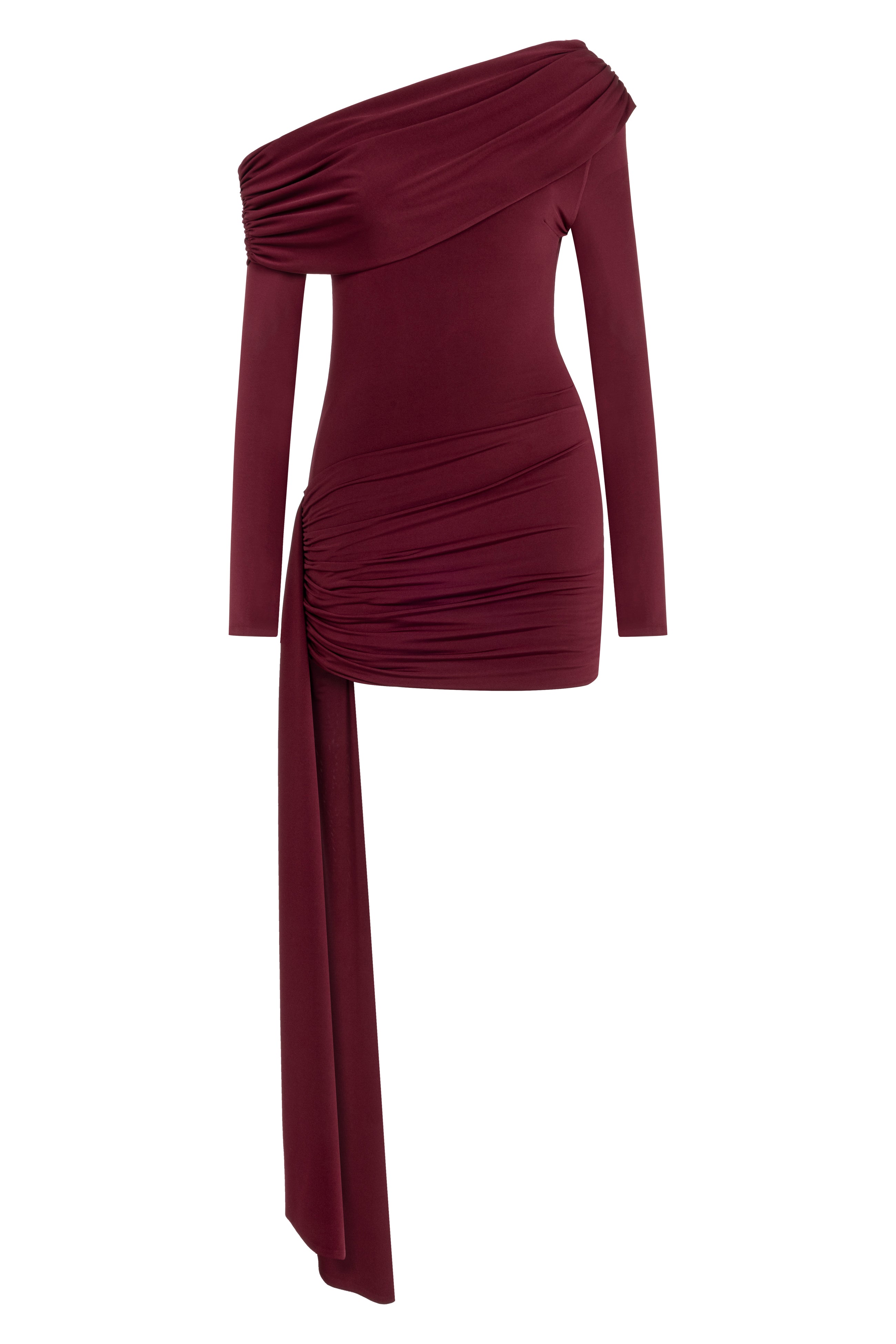 Bordo tek omuz uzun kollu drapeli mini elbise