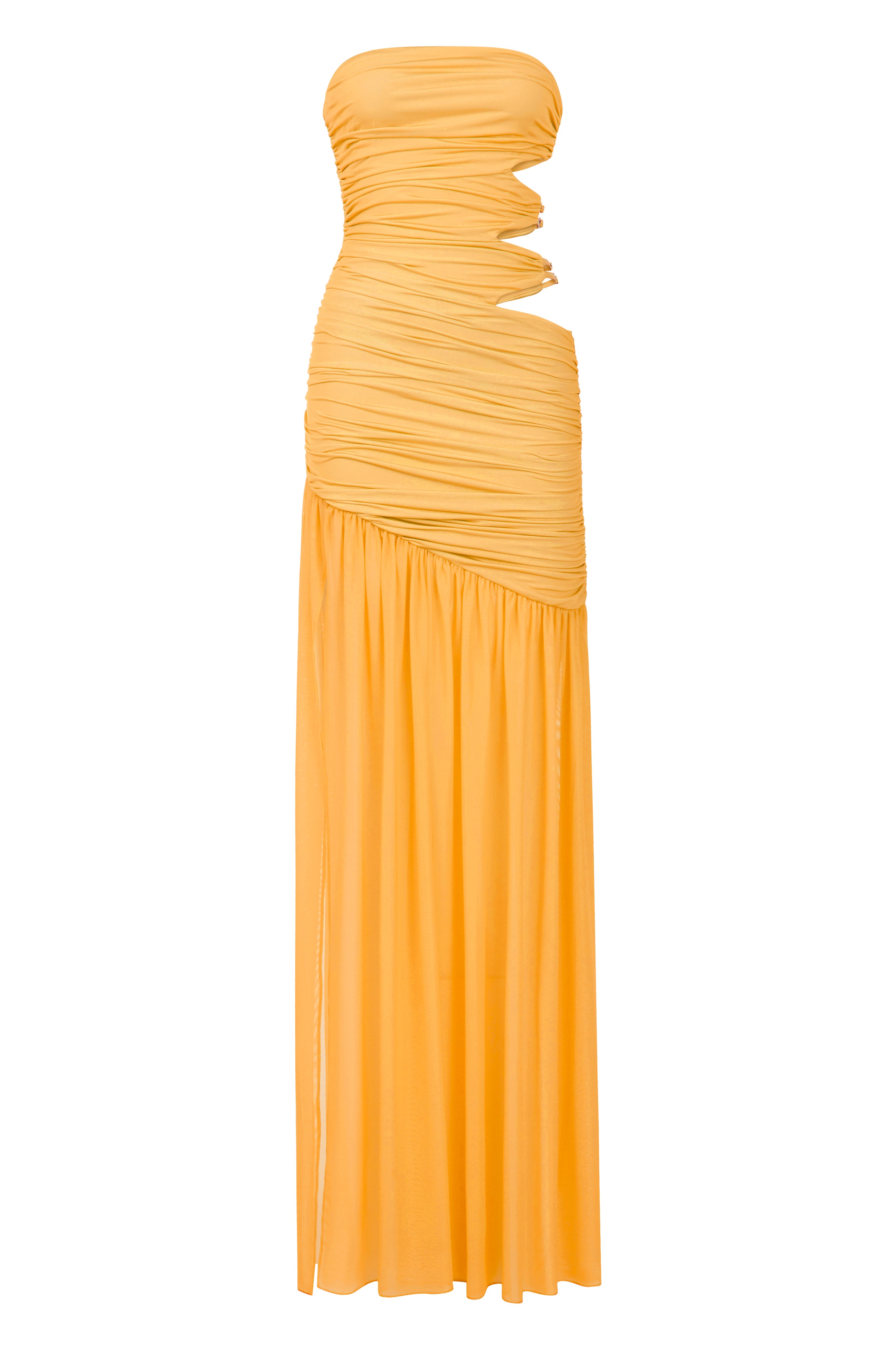 This dress, in a vibrant orange color, features an asymmetrical design and ruching details, capturing attention with its unique side cutouts. These cutouts are complemented by faux-leather belts that perfectly match the dress's color, showcasing exceptional craftsmanship. The anti-slip detail on the inner back ensures comfort, while the ruched tulle skirt adds movement to the dress. The thigh-high slit introduces a modern and striking touch, additionally enhancing the overall design.