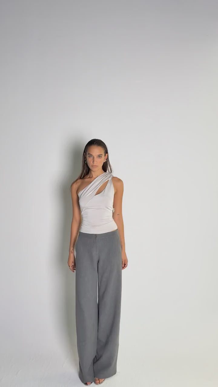 Tek omuzlu jarse bluzumuz, önde drape detayı ve kesiğiyle dikkat çekerken, asıl etkiyi arkada yapıyor. Omuzdan bele uzanan iri metalik boncuklarla çerçevelenmiş tamamen açık sırtı ve fit siluetiyle hem minimal hem maksimalist bir duruş sunuyor.